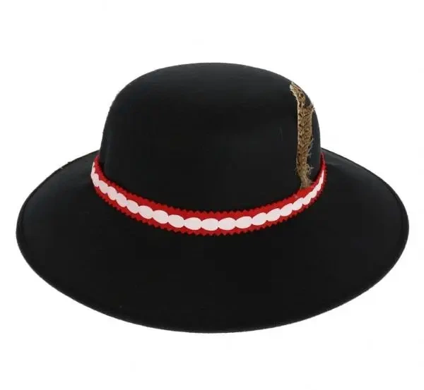 " KAPELUSZ GÓRALSKI Z PIÓRKIEM Obwód: 58 cm Kapelusz wykonany z włókniny imitującej filc w kolorze czarnym. Rondo obszyte dodatkowo materiałem co zwiększa jego trwałość. Powyżej ronda znajduje się czerwono - biała lamówka z góralskim wzorem. Dodatkowo do lamówki przymocowane jest piórko. Usztywnione rondo kapelusza zabezpiecza przed nieefektownym opadaniem i pozwala na pełną swobodę. Wewnętrzna część kapelusza pokryta jest miłym w dotyku materiałem. "