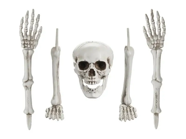 Dekoracja Szkielet składająca się z 5 pojedynczych elementów - czaszki, rąk i nóg, przeznaczona do użytku wewnętrznego i zewnętrznego. Skład: PP - 99%, żelazo - 1%.