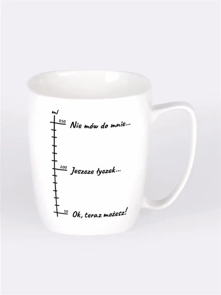 Nie mów do mnie teraz... chyba że masz drugą kawę! Przedstawiamy wyjątkowy kubek stworzony dla prawdziwego kawosza. Obserwuj, jak wraz z każdym łykiem Twoja chęć na rozmowę stopniowo rośnie. Gdy kubek jest pełen, potrzebujesz chwili wytchnienia, a gdy na dnie zostaje już tylko kilka kropel aromatycznego napoju, jesteś gotowy na podbicie świata. Ten kubek to historia o poranku każdego z nas. Wyobraź sobie tę scenę: budzisz się, słońce leniwie przebija się przez zasłony, a Ty sięgasz po swoją ulubioną filiżankę. Pierwszy łyk... i świat zwalnia. To właśnie ten moment, kiedy potrzebujesz chwili tylko dla siebie, kiedy nawet najlepszy przyjaciel/mąż/dziecko może poczekać. Podaruj ten kubek sobie lub komuś bliskiemu, kto tak jak Ty docenia magię porannej kawy. Idealny prezent dla miłośnika kawy istnieje! Kubek z porcelany Pojemność: 380 ml Pojemność użytkowa: 360 ml Zapakowany w szykowny kartonik Idealny prezent dla kawosza Nadruk po dwóch stronach kubka, logo na spodzie Można myć w zmywarce