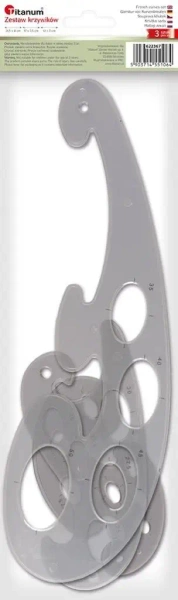 Ten zestaw zawiera trzy krzywiki, które doskonale sprawdzą się przy rysowaniu krzywizn takich jak parabole, hiperbole oraz elipsy. Dzięki różnorodności kształtów i rozmiarów, każdy projekt stanie się łatwiejszy do wykonania. Wymiary krzywików to: 31,5x9 cm, 17x7,5 cm i 13x7 cm.