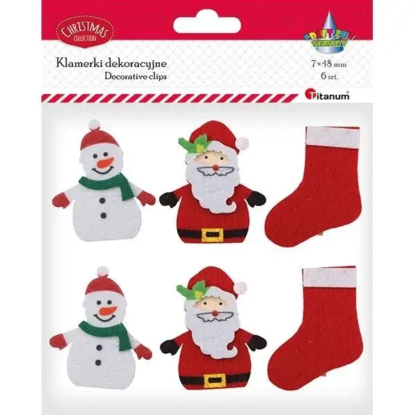 Klamerki drewniane z dekorem naturalne 7x48mm bałwanek 47x55mm, Mikołaj 47x54mm, skarpeta 43x53mm 6szt.