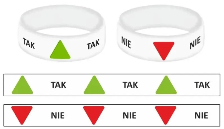 Komplet silikonowych opasek na rękę z komunikatami TAK i NIE.