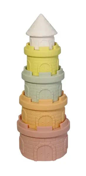 Gumowe klocki dla najmniejszych dzieci. Po ułożeniu piramidki powstaje wieża zamkowa. Produkt rozwija u maluszków logiczne myślenie. Produkt zapakowany w worek z siateczki.