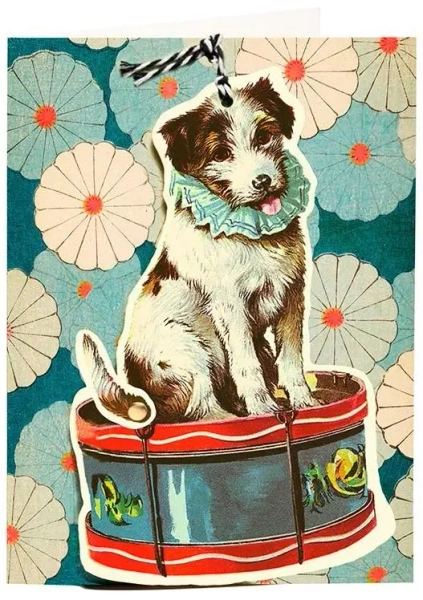Karnet B6 i zawieszka z kopertą - Pies i bęben, w środku bez tekstu, wyprodukowany w Wielkiej Brytanii.