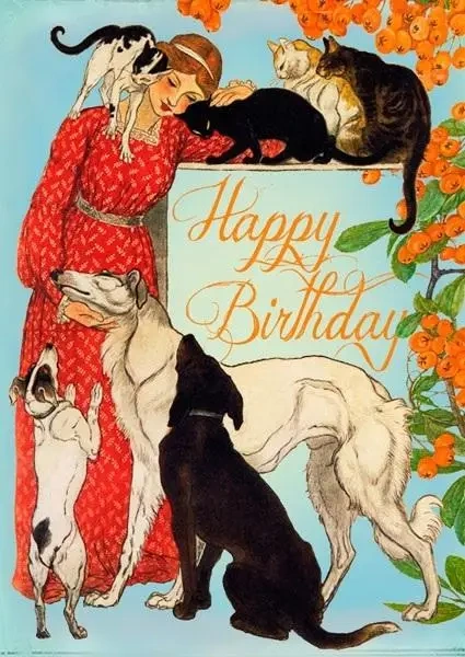 Karnet B6 z kopertą Urodziny Kobieta z psami i kotami, w środku bez tekstu, wyprodukowany w Wielkiej Brytanii.