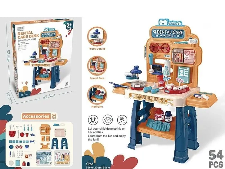 zestaw stół dentysty z wyposażeniem, wym.rozłożonego 61x51x23cm, 54 części; 52,5x42,5x10,5cm, Box