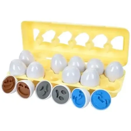 Nauka kształtów i kolorów: Dzięki kształtom na połówkach jajek, dzieci mają doskonałą okazję do nauki rozpoznawania różnych emocji i mimiki twarzy. Dodatkowo, różnorodność kolorów wspiera naukę rozpoznawania i nazewnictwa barw, co stanowi ważny element w edukacji przedszkolnej. Ta interaktywna metoda nauki zachęca dzieci do aktywnego uczestnictwa w zabawie i kreatywnego eksplorowania świata.