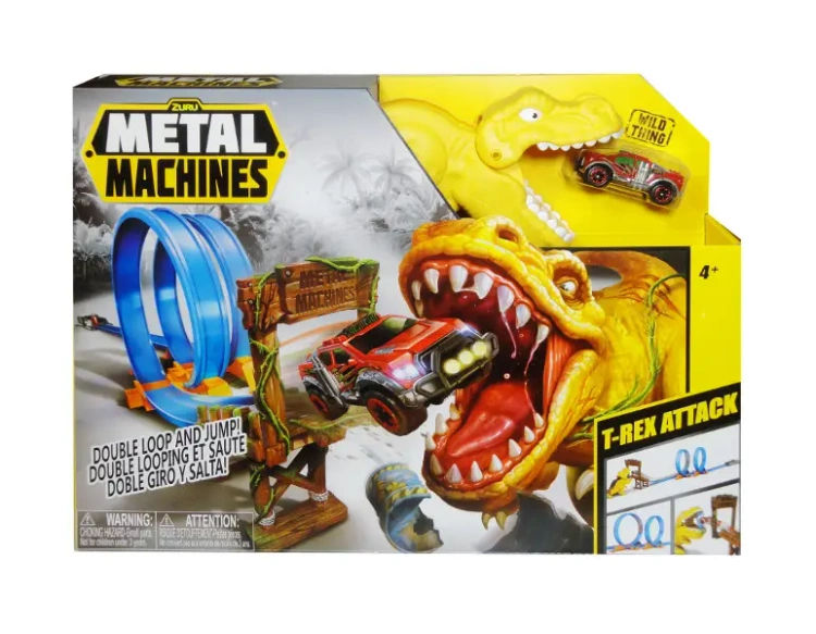 - Kaskaderski zestaw z zabawkowym samochodzikiem Metal Machines Atak T-Rexa dla dzieci w wieku od 4 lat.