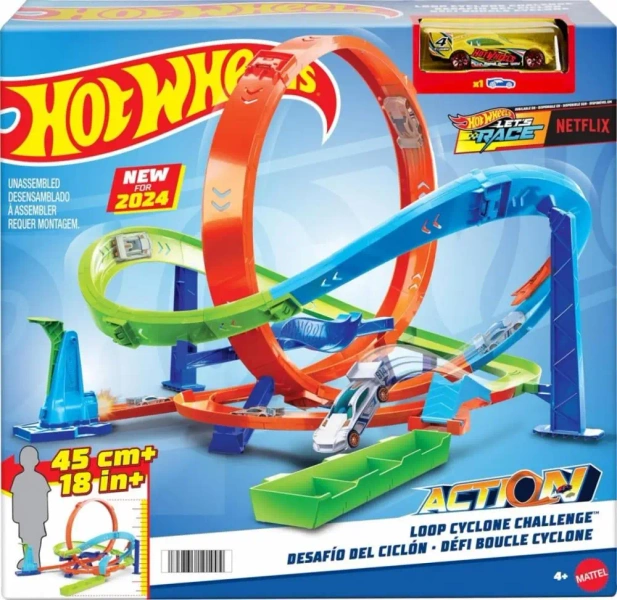 Ścigaj się i akrobuj na zestawie torów Hot Wheels Action! Wystrzel dołączony pojazd w skali 1:64 przez pętle bumerangu i wróć na start, aby wystrzelić ponownie i kontynuować wyścig! Odwróć rampę i wystrzel z odpowiednią mocą, aby zdobyć jak najwięcej punktów. Obie opcje powodują, że samochody pokonują niesamowite pętle i zakręty, które zapewniają ekscytującą jazdę przy dużych prędkościach Zestaw charakteryzuje się prostym i łatwym przechowywaniem: wystarczy odwrócić elementy toru i złożyć je. Ma nawet uchwyt do przenoszenia. To świetna zabawka dla dzieci w wieku od 4 lat. W zestawie znajduje się 1 autko.
