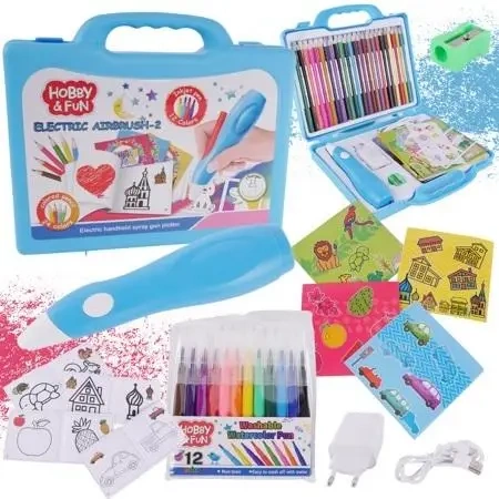 W zestawie znajduje się również interesujący aerograf elektryczny, który umożliwia dzieciom malowanie w nowoczesny sposób. Wystarczy wybrać ulubiony kolor, umieścić pisak w aerografie i nacisnąć przycisk, by rozpylić kolor na powierzchni tworzenia. Urządzenie jest ładowane za pomocą USB, co pozwala na dłuższe korzystanie.