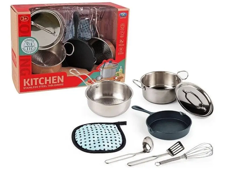 Zestaw garnków metalowych, z akcesoriami kuchennymi; 34,5x24x14cm,