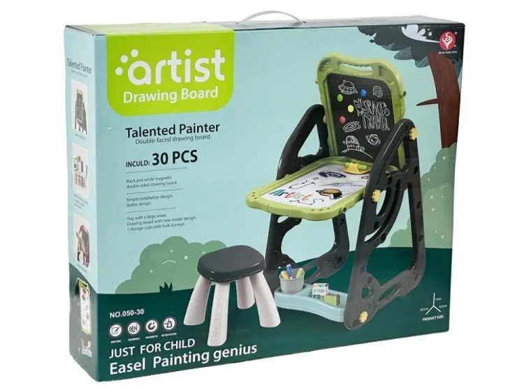 Tablica dwustronna na stelażu, ze stołeczkiem, wym.Rozłożonej 90x55x47,5cm; 59x49,5x13cm