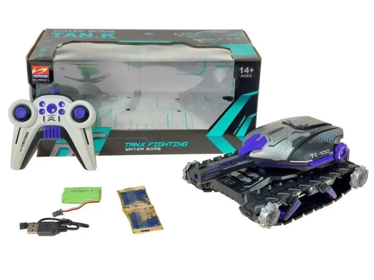 Czołg na radio 28,5x15,5x12,5cm, strzelający wodnymi bombami, ładowarka usb; 36x18x16,5cm, w/b
