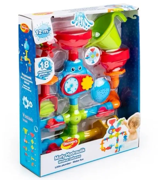 Co wyczarujemy z kolorowych kolanek, rur i zaworów? Umilacza dziecięcych kąpieli! Zestaw zawiera aż 18 elementów, które można ze sobą łączyć na różne sposoby, tak, aby zabawa się nie nudziła. Stwórz obieg dla wody, wlej ją dołączonym kubeczkiem do lejka , żeby przepłynęła przez kolorowy wodociąg, wprawiając w ruch elementy! Sprawdź jak woda tryska przez dziurki w słuchawce, obserwuj jak przepływając przez wiatraczek, obraca go dookoła. Poza walorem czysto rozrywkowym, zestaw także rozwija najmłodszych, zapewniając im twórcze zajęcie oraz ucząc odkrywania zależności przyczynowo - skutkowych. Do zabawki dołączone są przyssawki, dzięki którym można ją przymocować do gładkiej, czystej powierzchni, aby nie przesuwała się podczas korzystania z niej.