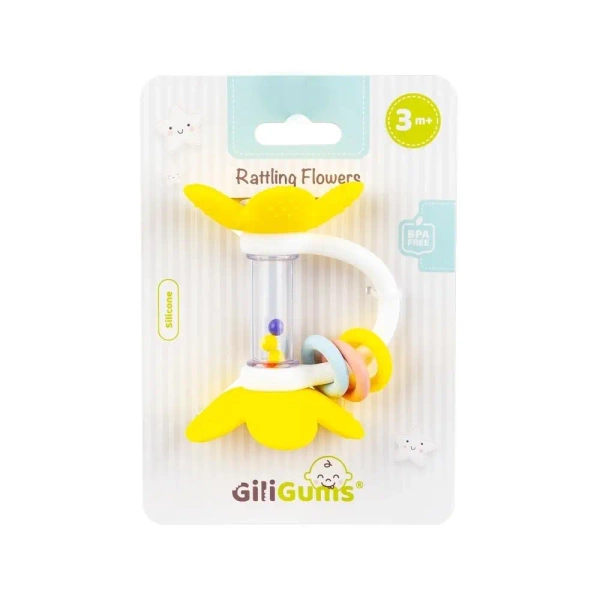 Słonecznie żółciutkie kwiatki nastrajają pozytywnie, wesoło przy tym grzechocząc! Ta praktyczna zabawka posiada tubę wypełnioną grzechoczącymi koralikami, wygodny uchwyt, ułatwiający trzymanie, i dwa gryzakowe kwiatki z wypustkami na płatkach. Podczas gryzienia będą one delikatnie masować obolałe dziąsła ząbkującego malucha, przynosząc mu ulgę. Na uchwycie zabawki znajdują się trzy ruchome, kolorowe obręcze, a przesuwanie ich może stanowić dodatkową rozrywkę dla bobasa.