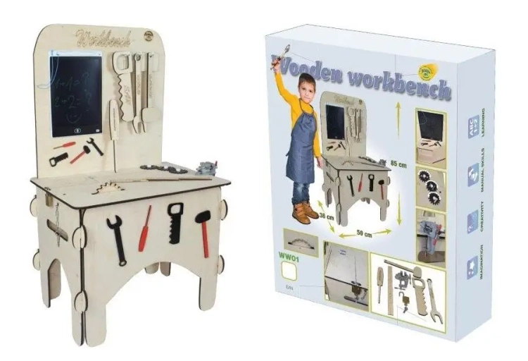 DUŻY, drewniany, naturalny warsztat majsterkowicza!!! Zawiera imadło, zestaw narzędzi, kłódkę z kluczami, piłę tarczową, tablet-znikopis z rysikiem oraz zębatki ruchome z wizualizacją narzędzi i miarkę stolarską. Produkt znajduje się w opakowaniu kolorowym!