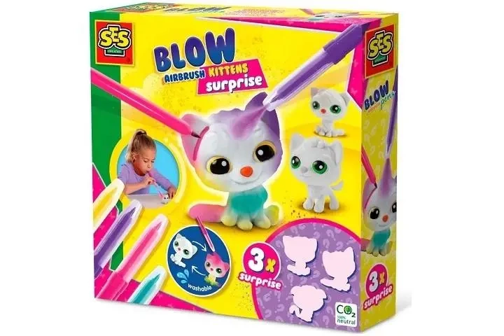 W opakowaniu na odkrycie czekają aż trzy niespodzianki, które z kociaków znajdziesz w środku? Dzięki czterem kolorowym pisakom do dmuchania możesz nadać każdemu kotkowi wesołe kolory, kropki i paski. Skończone? Umyj je pod bieżącą wodą i są gotowe na nową kreację!