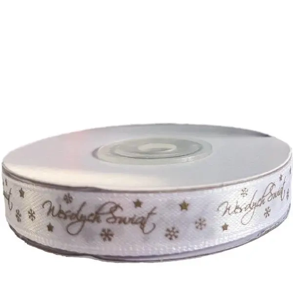 Odkryj elegancką wstążkę satynową w śnieżnobiałym odcieniu. Idealnie sprawdzi się do dekoracji świątecznych, dodając niepowtarzalny klimat dzięki delikatnemu złotemu nadrukowi "Wesołych Świąt".