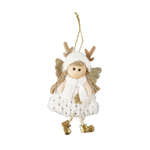 Świąteczna zawieszka dekoracyjna w kształcie aniołka. Dostępna w trzech wariantach kolorystycznych - białym, różowym oraz szarym. Ozdoba zawiera błyszczące elementy brokatowe. Sukienka oraz czapeczka aniołka została wykonana z materiału imitującego futerko. Nóżki są ze sznurka, nieusztywnione. Dekoracja zawiera sznurek umożliwiający powieszenie ozdoby. Wymiar zawieszki: 15 cm.