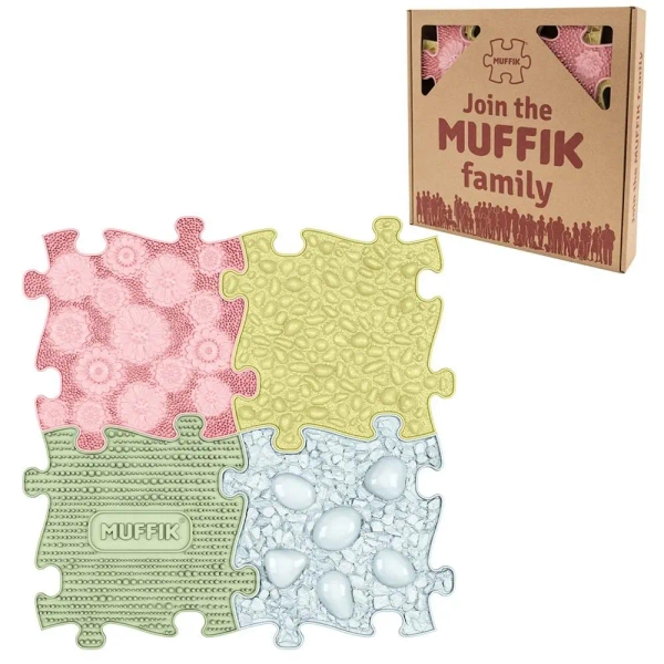 Zestaw startowy MUFFIK family to klucz do zdrowego rozwoju i szczęśliwego dzieciństwa dla maluchów. Zestaw zawiera starannie dobrane maty ortopedyczne, które nie tylko upiększą pokój Twojego dziecka delikatnymi, pastelowymi kolorami, ale przede wszystkim wspomogą prawidłowy rozwój jego układu mięśniowo-szkieletowego. Zestaw zawiera cztery sztuki mat ortopedycznych (twarde i miękkie). Twarde powierzchnie mat intensywnie masują każdy milimetr stopy i maksymalizują krążenie krwi. Miękkie służą relaksowi, regeneracji i delikatnemu ukrwieniu stóp, co ma kluczowe znaczenie w ich wzmocnieniu i rehabilitacji. Starsze dzieci stymulują podeszwy stóp i ćwiczą sklepienie podłużne i poprzeczne stóp. U dorosłych maty wspomagają gimnastykę żylną, co jest istotne w walce z zakrzepicą i żylakami. Wymiary opakowania: 29 x 5 x 30 cm Wiek: 12m+