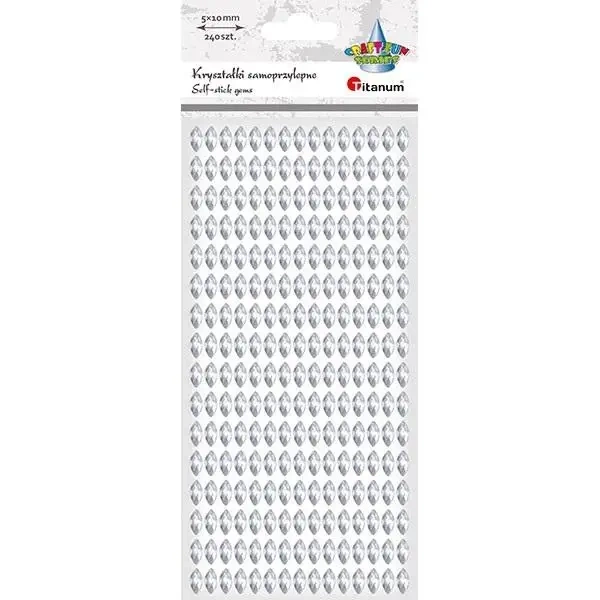 Te srebrne kryształki samoprzylepne o rozmiarze 5x10 mm to doskonały wybór dla osób, które chcą dodać blasku swoim projektom. Zestaw zawiera 240 sztuk kryształków, co daje szerokie możliwości dekoracyjne.