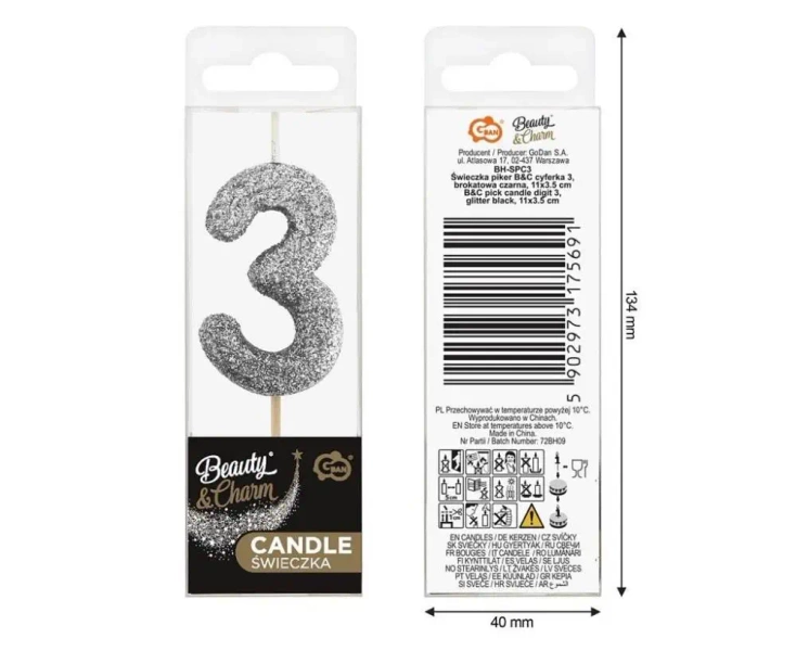Świeczka piker 3 czarna brokatowa 11x3.5 cm - Godan