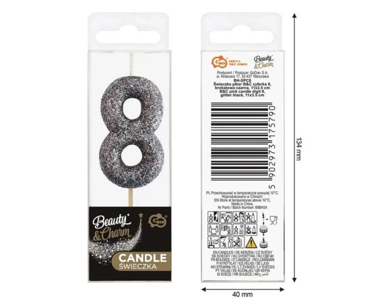 Świeczka piker 8 czarna brokatowa 11x3.5 cm - Godan