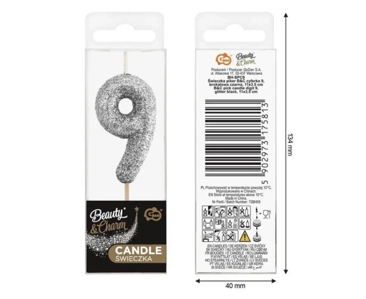 Świeczka piker 9 czarna brokatowa 11x3.5 cm - Godan