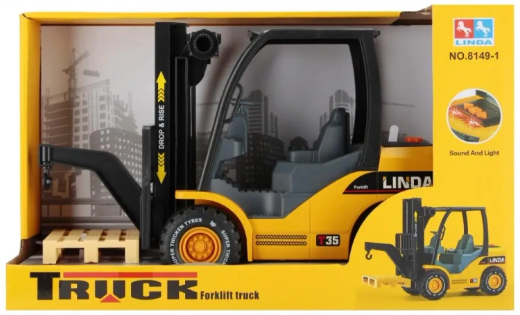 Zalety produktu Wózek Widłowy to niezbędna maszyna na każdej budowie, hurtowni czy hali, wózek posiada funkcję pull and back dzięki czemu po pchnięciu pojazdu do przodu kontynuuję jazdę samodzielnie, posiada ruchome elementy, posiada efekty dźwiękowe oraz świetlne.