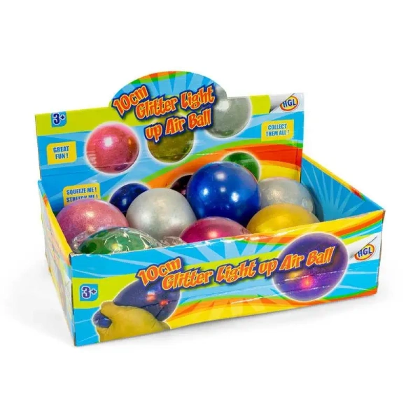Wypełniona powietrzem piłka w błyszczącym kolorze. Potrząśnij piłką, a światło wewnątrz się aktywuje, oświetlając zewnętrzną powierzchnię blaskiem. Ściśnij ją, a wybrzuszy się, gdy powietrze skieruje się na boki piłki. To świetna zabawka to fantastyczna alternatywa dla piłki antystresowej. Dostępna w kolorze: niebieskim, złotym, różowym, srebrnym, zielonym lub fioletowym.