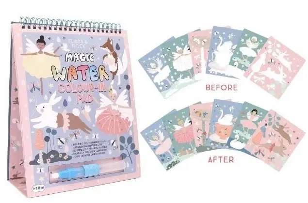 Kolorowanka wodna z pisakiem i podpórką to świetna zabawa dla najmłodszych. Wystarczy napełnić pisak wodą i zachęcić dziecko do kreatywnej zabawy, aby zobaczyć, jak kolory i kształty magicznie się pojawiają, a po wyschnięciu znikają. Dziecko będzie się świetnie bawić, odkrywając urocze baletnice, zaczarowane łabędzie, przyjazne leśne zwierzęta i nie tylko. Sześć zabawnych kart jest połączonych w spiralnie oprawionej okładce, dzięki czemu można je odwracać po ukończeniu. Podpórka wygodnie podtrzymuje karty wielokrotnego użytku. Po zakończeniu zabawy wystarczy złożyć podpórkę, a dzięki elastycznej gumce pisak zawsze będzie na swoim miejscu.