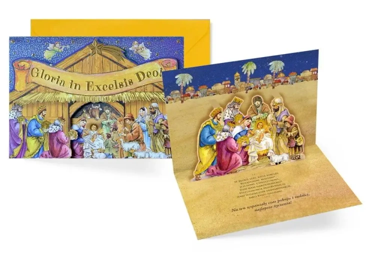 Jest to niezwykle oryginalna gratka z serii Pop-Up, specjalnie stworzona na okres Bożego Narodzenia. Główną jej cechą charakterystyczną jest znajdujący się w środku 3D element, który w pełni prezentuje się dopiero po odchyleniu kartki. Wnętrze karnetu skrywa starannie dobrane, krótkie życzenia, które nie tylko są estetycznie umieszczone, ale dodatkowo odznaczają się przestrzenią na Twoją indywidualną dedykację.