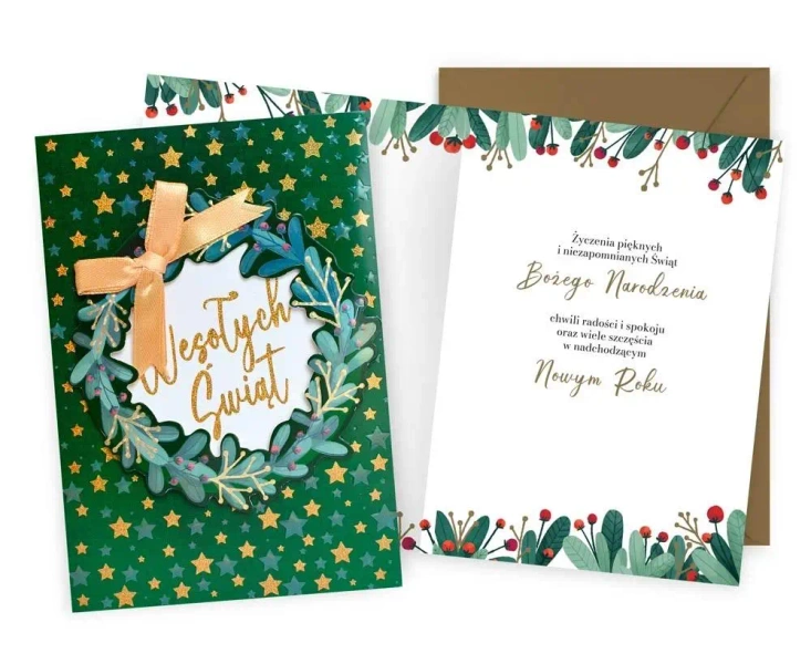 Kartka Dream Cards DK-1190. Kartka B6 z ozdobnej serii Dream Cards na Boże Narodzenie - nieduża, ale robi wrażenie dzięki atrakcyjnej kolorystyce i ciekawym zdobieniom. To idealny wybór łączący przyjazną cenę z jakością. Cechy szczególne: wielkość: B6, 16.6 x 11.7 cm po złożeniu, koperta: w zestawie, kolorowa, zdobienia: różnorodne, bogate (w zależności od wzoru: przyklejane dekoracje, elementy biżuteryjne, odstawniki, brokat metaliczne folie, tłoczenia itp.), okazja: Boże Narodzenie.