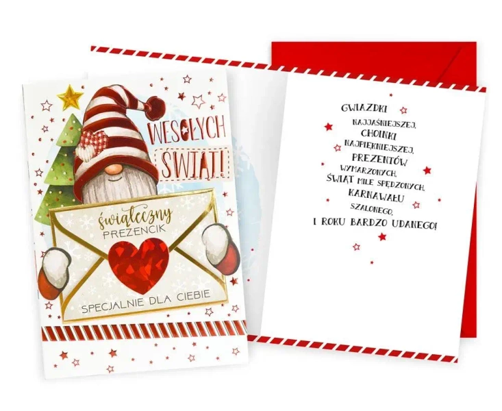Kartka Dream Cards DK-1195. Kartka B6 z ozdobnej serii Dream Cards na Boże Narodzenie - nieduża, ale robi wrażenie dzięki atrakcyjnej kolorystyce i ciekawym zdobieniom. To idealny wybór łączący przyjazną cenę z jakością. Cechy szczególne: wielkość: B6, 16.6 x 11.7 cm po złożeniu, koperta: w zestawie, kolorowa, zdobienia: różnorodne, bogate (w zależności od wzoru: przyklejane dekoracje, elementy biżuteryjne, odstawniki, brokat metaliczne folie, tłoczenia itp.), okazja: Boże Narodzenie.