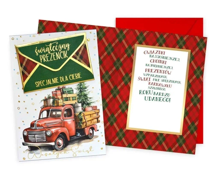 Kartka Dream Cards DK-1205. Kartka B6 z ozdobnej serii Dream Cards na Boże Narodzenie - nieduża, ale robi wrażenie dzięki atrakcyjnej kolorystyce i ciekawym zdobieniom. To idealny wybór łączący przyjazną cenę z jakością. Cechy szczególne: wielkość: B6, 16.6 x 11.7 cm po złożeniu, koperta: w zestawie, kolorowa, zdobienia: różnorodne, bogate (w zależności od wzoru: przyklejane dekoracje, elementy biżuteryjne, odstawniki, brokat metaliczne folie, tłoczenia itp.), okazja: Boże Narodzenie.