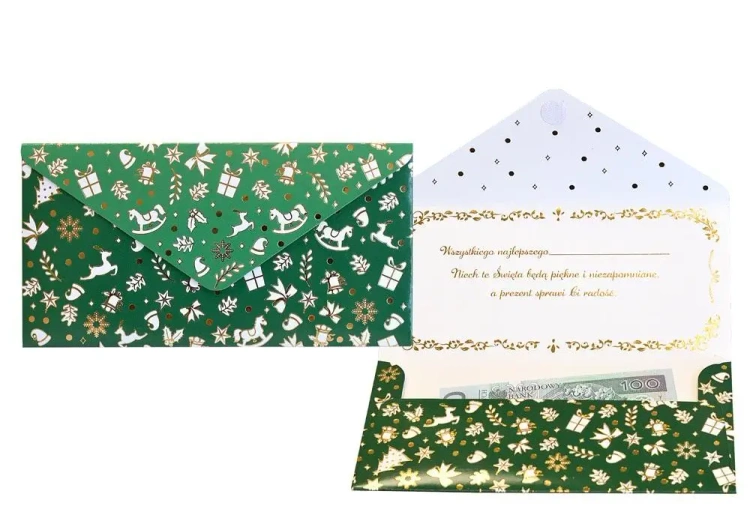 Koperta podarunkowa KOP-003. Koperta podarunkowa jest eleganckim sposobem na podarowanie bliskiej osobie banknotu lub karty podarunkowej. Koperta jest kolorowa i uszlachetniona metalizowaną folią hot-stamp, jest solidnie wykonana i wyposażona w rzep, co umożliwia jej wielokrotne otwieranie i zamykanie. Koperta zawiera życzenia w środku. Specyfikacja: wymiary: 20 x 10,5 cm (po złożeniu) wnętrze: życzenia w środku okazja: BN