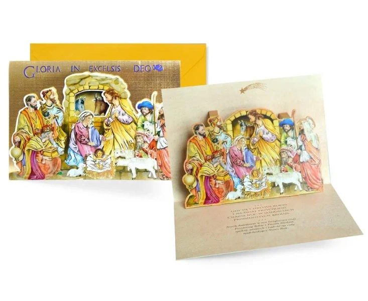 Kartka Pop-Up PU-022 "Gloria in excelsis deo" Boże Narodzenie Kartka z serii Pop-Up to idealny pomysł na Boże Narodzenie Kartki wyróżniają się przestrzennym elementem wewnątrz, który uwypukla się wraz z jej otwarciem. W środku kartki znajdują się krótkie starannie dopasowane życzenia z miejscem na własną dedykację. Eleganckiego akcentu każdej kartce nadaje dołączona koperta mieniąca się perłowym blaskiem. Cechy szczególne: wielkość: 11.7 x 16.6 cm po złożeniu koperta: biała perłowa zdobienia: połyskująca folia perlista, złota folia, doklejany papierowy element okazja: Boże Narodzenie