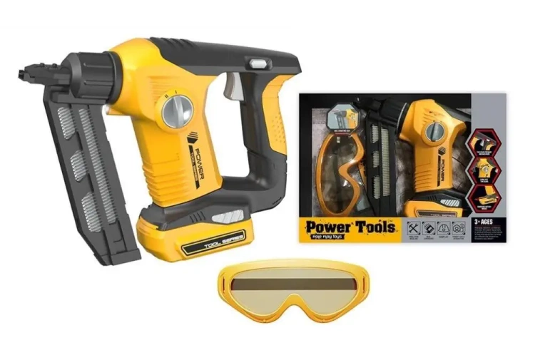 W zestawie: pistolet na gwoździe, gogle ochronne, Funkcje: gogle, regulacja gumki, pistolet na gwoździe, po naciśnięciu spustu rusza się końcówka, przeskakuje magazynek z gwoździami, 2 prędkości, 2 kierunki ruchu, odłączany moduł bateryjny, Pozostałe informacje: wym. pistoletu 19 x 24 x 6 cm, wym. gogli 16 x 6,5 cm, wym. opak. 32,5 x 23,5 x 6,5 cm, baterie 3 x aa niedołączone, 3+