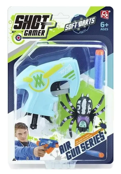 W zestawie: pistolet, 2 naboje, pająk cel, Funkcje: pistolet po naciśnięciu spustu wystrzeliwuje pocisk, pająk-cel po przyczepieniu do pionowej powierzchni pełza w dół, zabawa polega na strzelaniu do poruszających się celów, Pozostałe informacje: dł. pistoletu 13,5 cm, wym. opak. 29 x 19,5 x 4,5 cm, 6+