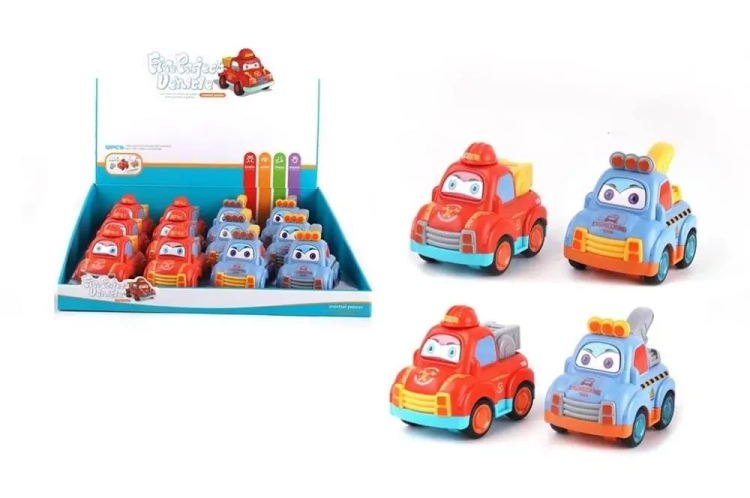 Opis: 12 szt/disp, dł. auta 9 cm, 2 wzory do wyboru: dźwig, wóz strażacki, napęd frykcyjny, wym. disp. 30,5 x 29 x 8 cm, 3+
