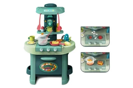 W zestawie: elementy do złożenia kuchni, garnek z pokrywką, 2 patelnie, 2 talerzyki, 7x kuchennych przyborów, 2 kubeczki, sól, sos, 4 figurki jedzenia, Funkcje: palnik - po przekręceniu pokrętła włącza się dioda i słychać odgłos gotowania, Pozostałe informacje: wym. opak. 51,5 x 63,5 x 13,5 cm, baterie 3 x aa niedołączone (palnik), 3+