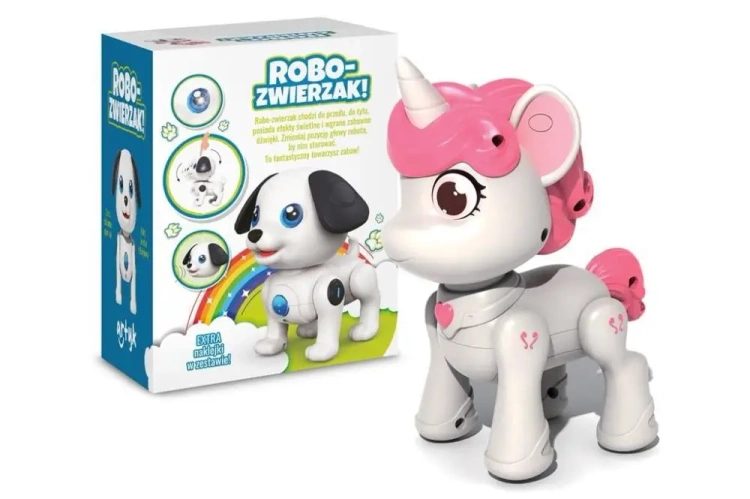 wys. 16 cm, funkcje: porusza się do przodu i do tyłu, po naciśnięciu na głowę zatrzymuje się, posiada efekty świetlne, wydaje zabawne odgłosy., wym. opak. 14 cm x 9 cm x 16 cm., baterie: 2 x aaa, niedołączone, 3+