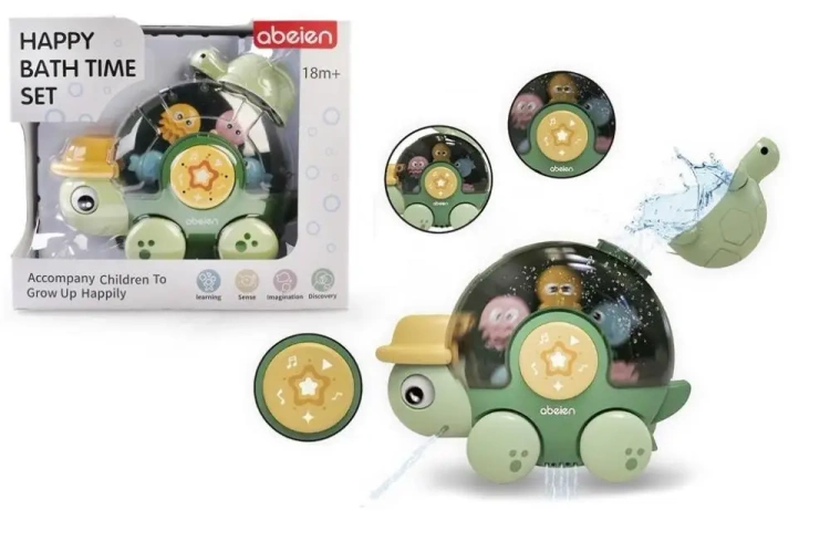 W zestawie: żółw na kółkach, żółw-miseczka do wlewania wody, półeczka do mocowania do ściany, 3 przyssawki, Funkcje: żółw posiada 2 miejsca do wlewania wody, kapelusz (ruszają się oczy), skorupa (obracają się zwierzątka w skorupie), piszczek, jeździ, Pozostałe informacje: wym. zabawki 20 x 15 x 8 cm, wym. opak. 24 x 20,5 x 11,5 cm, 18m+