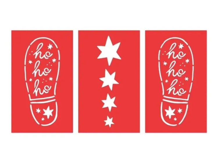 Papierowe szablony w kształcie śladów Mikołaja i gwiazdek, zestaw zawiera 3 różne wzory w kolorze czerwonym. Wymiary każdego z szablonów ok. 16.5 x 27.5 cm.(1 op. / 3 szt.)