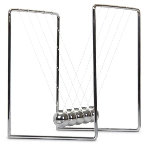 Duża wersja klasycznej zabawki kinetycznej na biurko. Odciągnij jedną z metalowych kul, a następnie puść, aby połączyć ją z innymi, wysyłając energię uderzenia przez łańcuch i sprawiając, że kula na drugim końcu zareaguje z równą siłą. Ta edukacyjna zabawka to nie tylko fascynujący przedmiot do oglądania, ale także demonstruje zachowanie pędu i energii w sposób, który jest łatwy do zrozumienia.