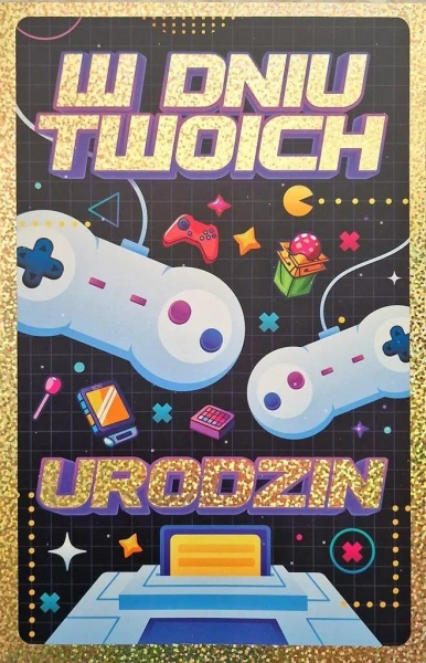 Karnet 2k. Klasyczny karnet na urodziny dla miłośników gier komputerowych i nie tylko. Uszlachetniony wysokiej jakości hotstampingiem ( złocenie ). Karnet zawiera życzenia.