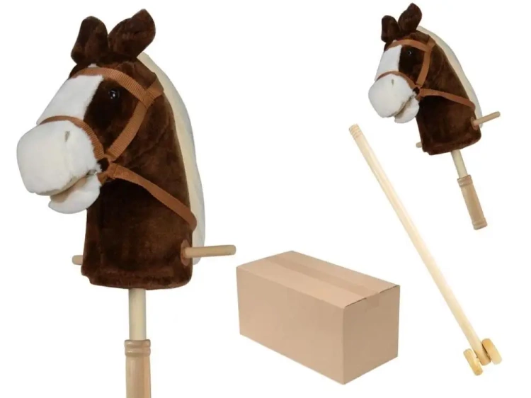 Koń z dźwiękiem drewniany kij składany z kółkami, kolor brązowy, głowa konia w środku styropian, rączki, pakowanie indywidualne karton b/o baterie nie załączone 2 x AA