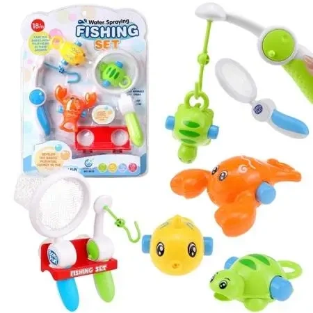 W skład zestawu wchodzi wędka oraz sitko, dzięki którym można łowić rybki. Dziecko może wybrać sobie narzędzie do łowienia i poczuć się jak prawdziwy wędkarz. Zestaw uzupełniają trzy kolorowe i urocze zabawki, rybka, krab i żółw. Każde z nich ma wygodny uchwyt, dzięki któremu maluch może łatwo złapać i bawić się nimi podczas kąpieli. Dziecko może przechowywać wędkę oraz sitko w specjalnym stojaku, dzięki czemu zabawki nie zgubią się i będą w jednym miejscu.