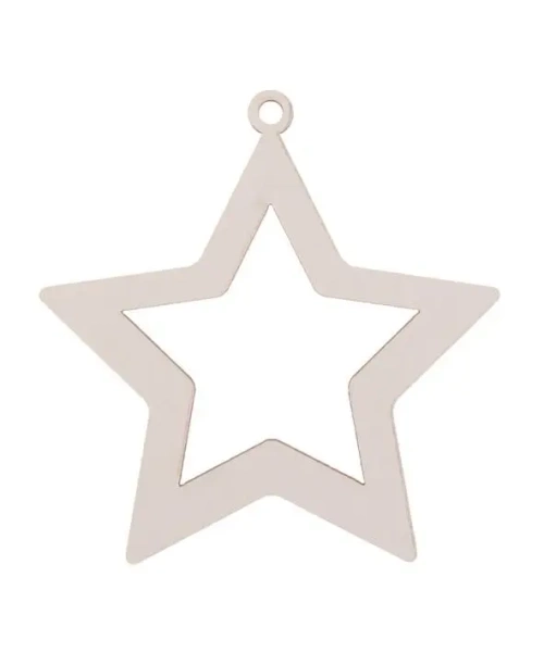 Drewniana bombka w kształcie gwiazdy biała. Średnica 8cm, wysokość całkowita 9cm. W opakowaniu 3szt