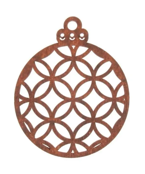 Drewniana bombka ażurowa malowana. Średnica 8cm, wysokość całkowita 10cm. W opakowaniu 3szt